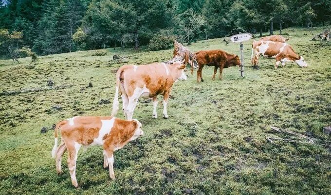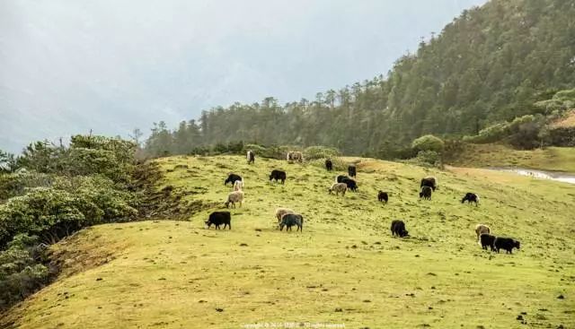 藏区牛羊到处跑,很可耐~满山坡的牛羊马都是放养在森林草甸里的,惬意地啃食牧草。