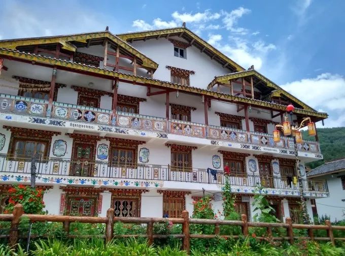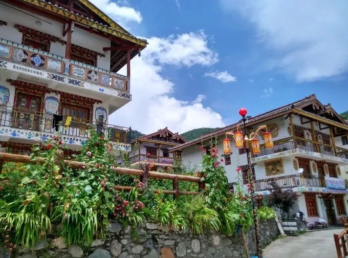 一排白色的藏式楼房雕琢着精美的彩纹,衬着黛色远山和蔚蓝长天。