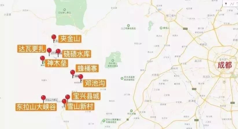 夹金山不是单独的景点,从宝兴开车往北朝小金县方向,整个路过的片区都属于夹金山风景区!
