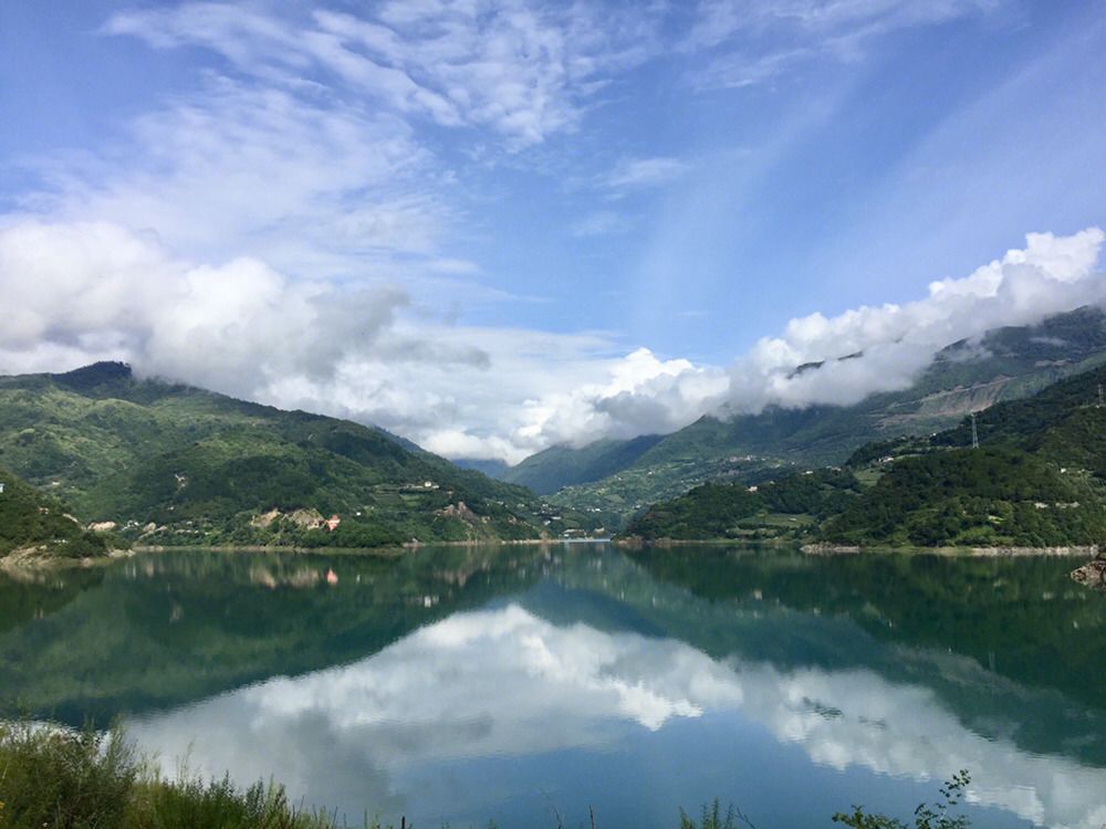 这个人工修建的大型水库,被群山围绕,视野很是开阔,远山云雾缭绕,湖面水雾迷蒙,下车伸展有些疲惫的身躯。